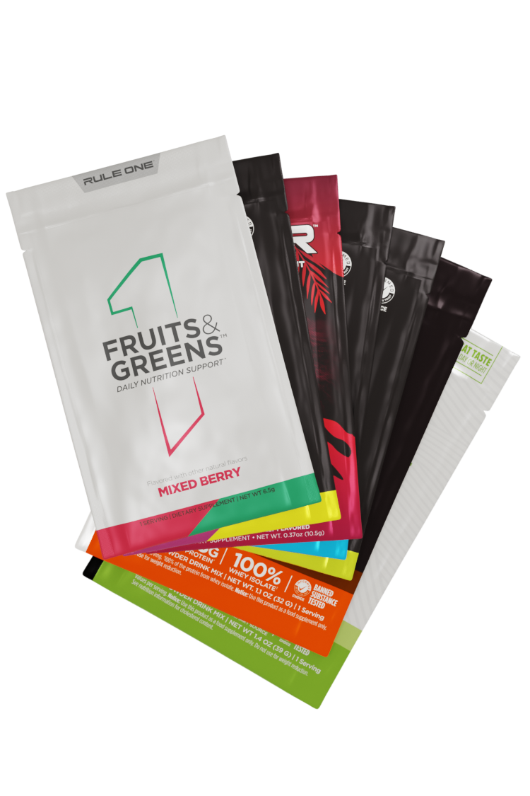 A kit containing 7 full serving samples to provide a comprehensive set of products to support your day - start to finish. Featuring Fruits & Greens (Mixed Berry), Energized Amino (Pineapple Passionfruit), ROAR (Peach Mango), Active BCAA (Blue Raspberry), Lytes (Blue Razz), R1 Protein Whey Isolate (Milk Chocolate), and Source 7 Protein (Pistachio Ice Cream).