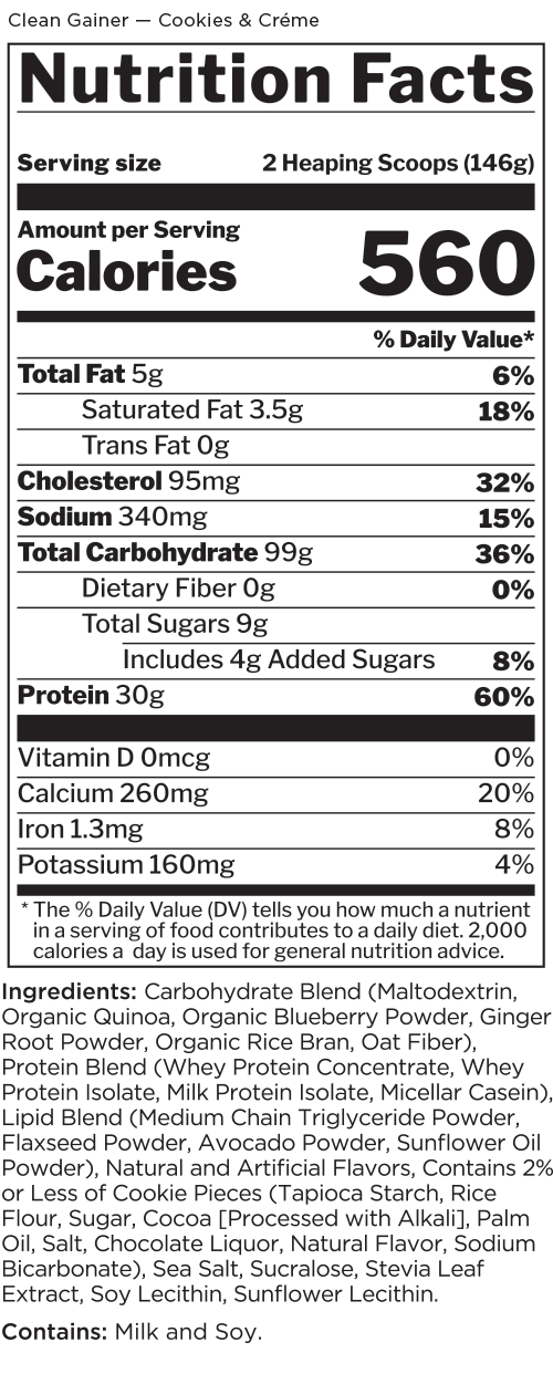 Consume after workouts, between meals, or before bed to boost daily calories and protein. Use Clean Gainer alongside meals—not as a replacement. For best results, use consistently with weight training.