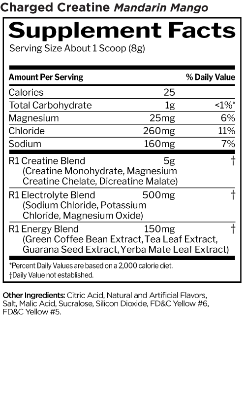 Charged Creatine provides 3 types of creatine (monohydrate, magnesium chelate, and di-malate) and adds the benefits of electrolytes and natural-source caffeine to help you power through the toughest training with extra intensity.^