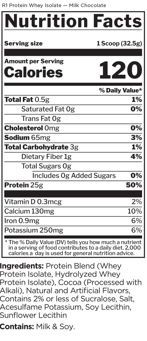 Directions: Mix about one scoop of R1 Protein Whey Isolate with 6–8 oz. of cold water, milk, or your favorite beverage in a shaker cup or a glass with a spoon. For added variety, blend with fruit or mix into cereal or yogurt.