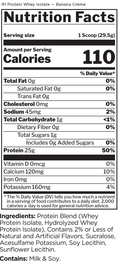 Directions: Mix about one scoop of R1 Protein Whey Isolate with 6–8 oz. of cold water, milk, or your favorite beverage in a shaker cup or a glass with a spoon. For added variety, blend with fruit or mix into cereal or yogurt.