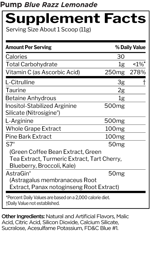 We formulated Pump with a capable combination of ingredients designed to help potentiate the physiological and psychological benefits of a great pump. Pump supports nitric oxide production to help enhance vascularity and size in hard-working muscles. Just add water, then exercise.^